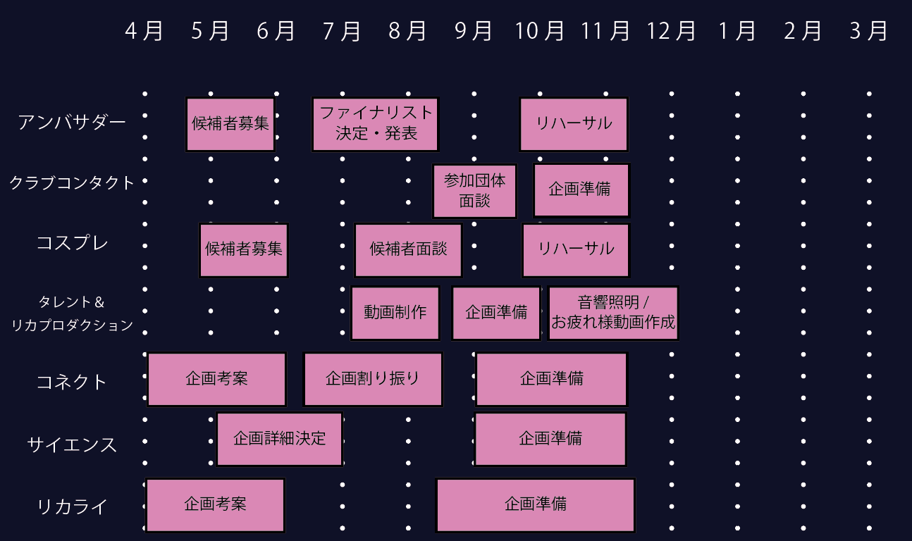 - コスプレコンテストというコスプレする候補者を募ってそれぞれのアピールポイントを発表し、それを部門ごとに評価するコンテストを運営する部署です。