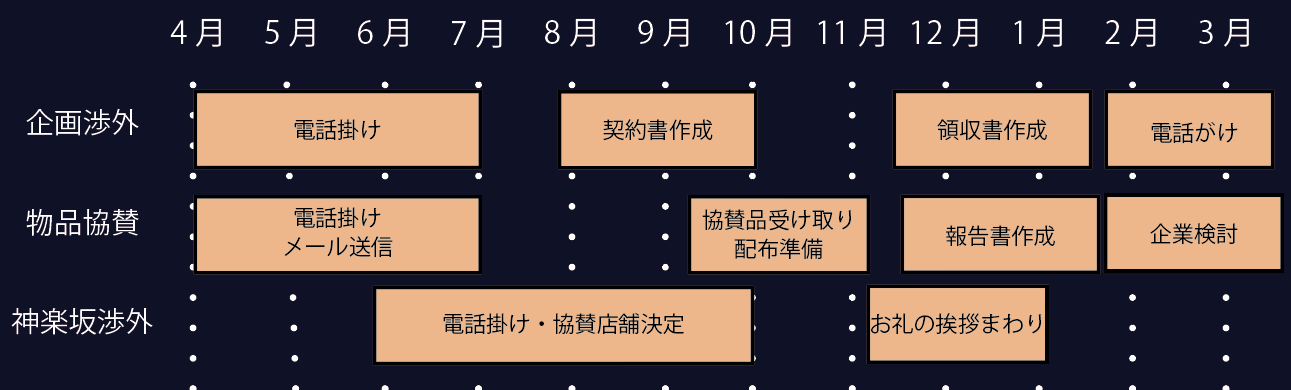 企業渉外と物品協賛は、指定されたシフトに沿って行動します。仕事内容は装飾物の設置・片付け、着ぐるみ、入口での応対、入試相談など様々です。神楽坂渉外は、神楽坂喫茶を運営します。