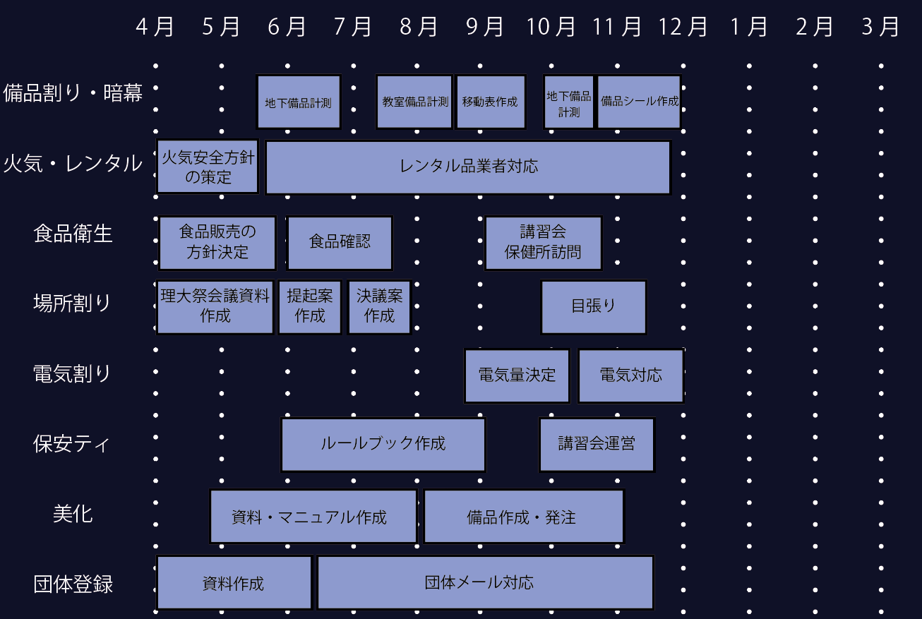 - 事前に大学にある備品や暗幕を計測し、理大祭当日に備品の移動の指示と暗幕の配布を行います。