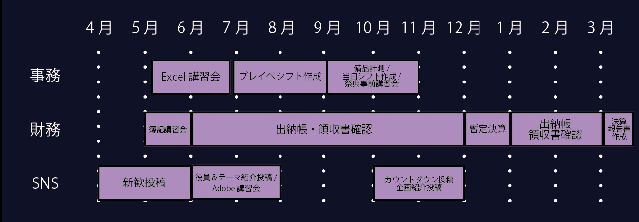 - 部室倉庫の備品管理、祭典関連のシフト作成、祭典開催に関する事故防止講習会等の運営をします。